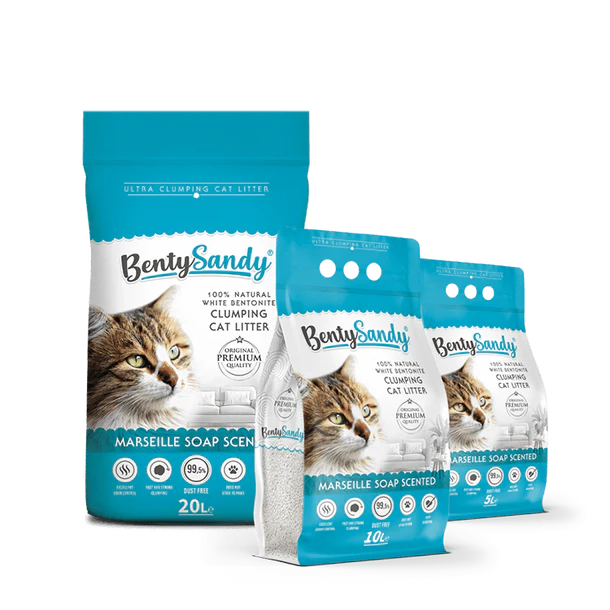 Thanks to the composition of 100% natural white bentonite mineral and the scent of Marseille Soap, it is a cleaner cat litter suitable for long-term use. High quality white bentonite naturally keeps bad odors under control, the Marseille Soap scent that emerges when bentonite is moistened creates a pleasant and clean odor. It gives an outstanding performance with its high clumping feature. It is available in 5 lt, 10 lt and 20 lt sizes
