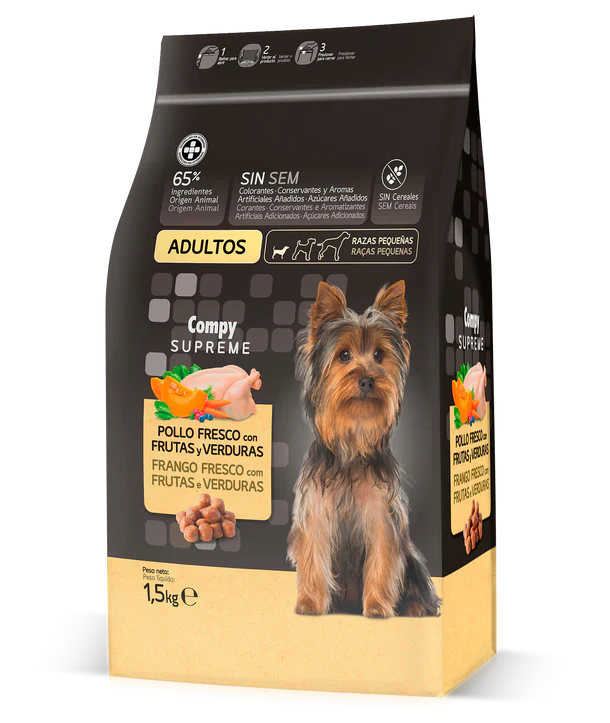 You're viewing: Compy Supreme for adult dogs of small breeds. with fresh chicken, fruit and vegetables. GRAIN FREE. (1.5kg) EGP300.00
