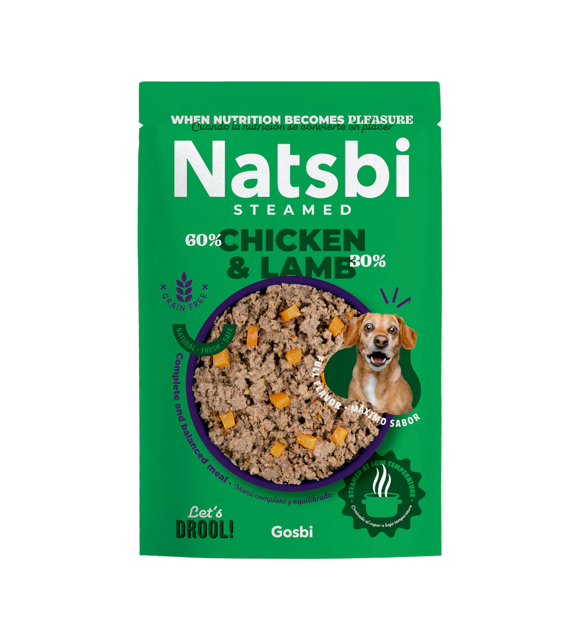 Natsbi Steamed Chicken&Lamb Dogs 200g achieves complete benefit thanks to the way it’s made; steamed, not diluted and prepared without added water.
